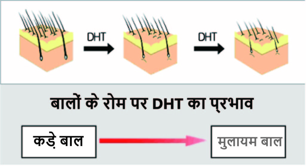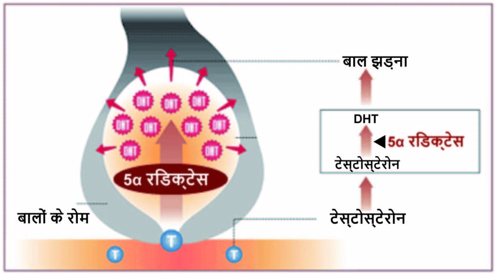 AGA (पुरुष पैटर्न गंजापन) का मुख्य प्रेरक एजेंट बालों की जड़ में DHT (डायहाइड्रोटेस्टोस्टेरोन) है। AGA ने बालों के झड़ने वाले क्षेत्र में बड़ी मात्रा में DHT की पुष्टि की है। डीएचटी एण्ड्रोजन टेस्टोस्टेरोन से 5α-रिडक्टेस द्वारा बनाया जाता है, और इस डीएचटी के उच्च स्तर बालों के विकास के चरण को समाप्त करते हैं। नतीजतन, बाल घने बालों में बढ़ने से पहले ही निकल जाते हैं, और कई पतले और छोटे बाल पतले हो जाते हैं।