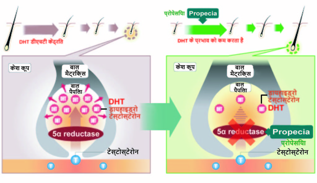 Propecia की क्रिया का तंत्र (बहुत आसानी से समझ में आने वाला आरेख) प्रत्येक आरेख MSD जानकारी है