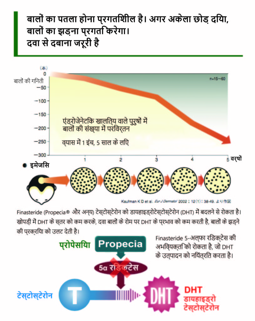 AGA (पुरुष पैटर्न गंजापन) प्रगतिशील है, और अगर अनुपचारित छोड़ दिया जाता है, तो बाल पतले हो जाएंगे। प्रोपेसिया इसे दबा देता है। Propecia DHT के उत्पादन को रोकता है, बालों के झड़ने को कम करता है और AGA की प्रगति को धीमा करता है।