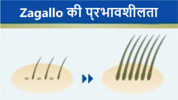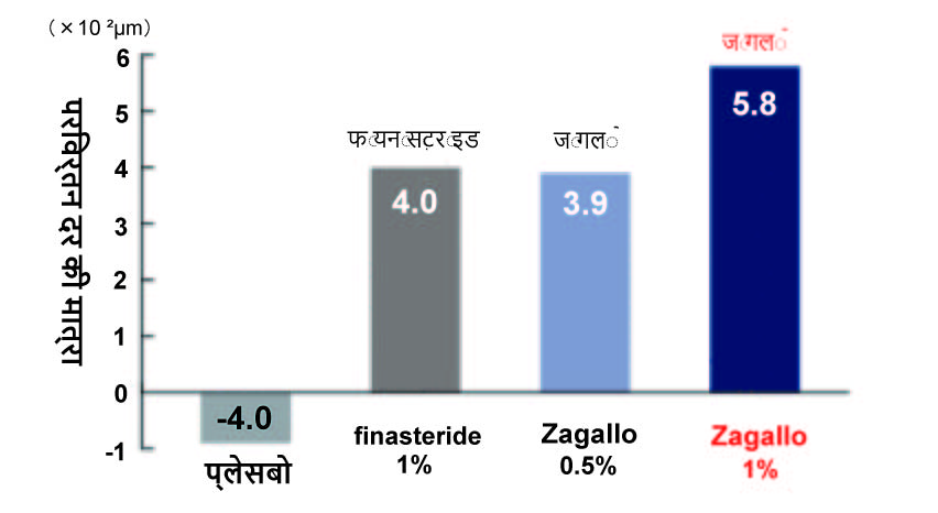 प्रोपेसिया (फाइनस्टेराइड) 1mg की तुलना में Zagallo 0.5 mg ने बालों की मोटाई में काफी वृद्धि की है। * मुकुट पर 2.54 सेमी के व्यास के साथ एक सर्कल के भीतर 30 माइक्रोन या उससे अधिक के व्यास के साथ गैर-वेलस बालों की कुल मोटाई