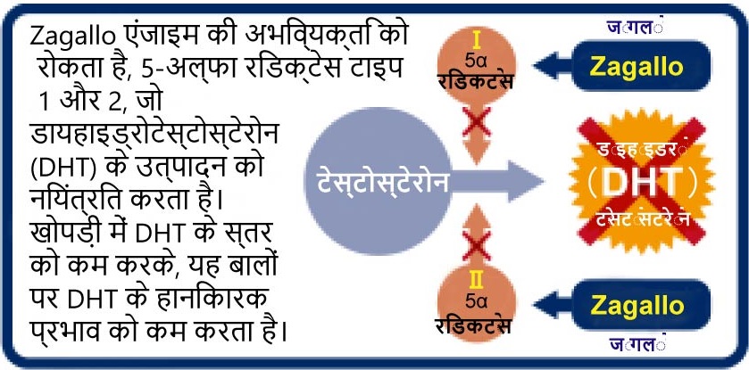 प्रोपेसिया की तरह, यह 5α-रिडक्टेस की क्रिया को दबा देता है, जो डीएचटी के उत्पादन में शामिल है, जो एजीए का कारण बनता है, लेकिन प्रोपेसिया केवल 5α-रिडक्टेस के प्रकार II को दबा देता है, जबकि ज़ागलो इसे दबा देता है। चूंकि यह 5α-reductase के प्रकार I और प्रकार II दोनों को दबा सकता है, इसलिए प्रोपेसिया की तुलना में बालों के विकास के बेहतर प्रभाव की उम्मीद की जा सकती है। नैदानिक परीक्षणों में, ज़ागलो 0.5mg के बारे में बताया गया है कि प्रोपेसिया 1mg के बाल विकास प्रभाव का लगभग 1.6 गुना है।